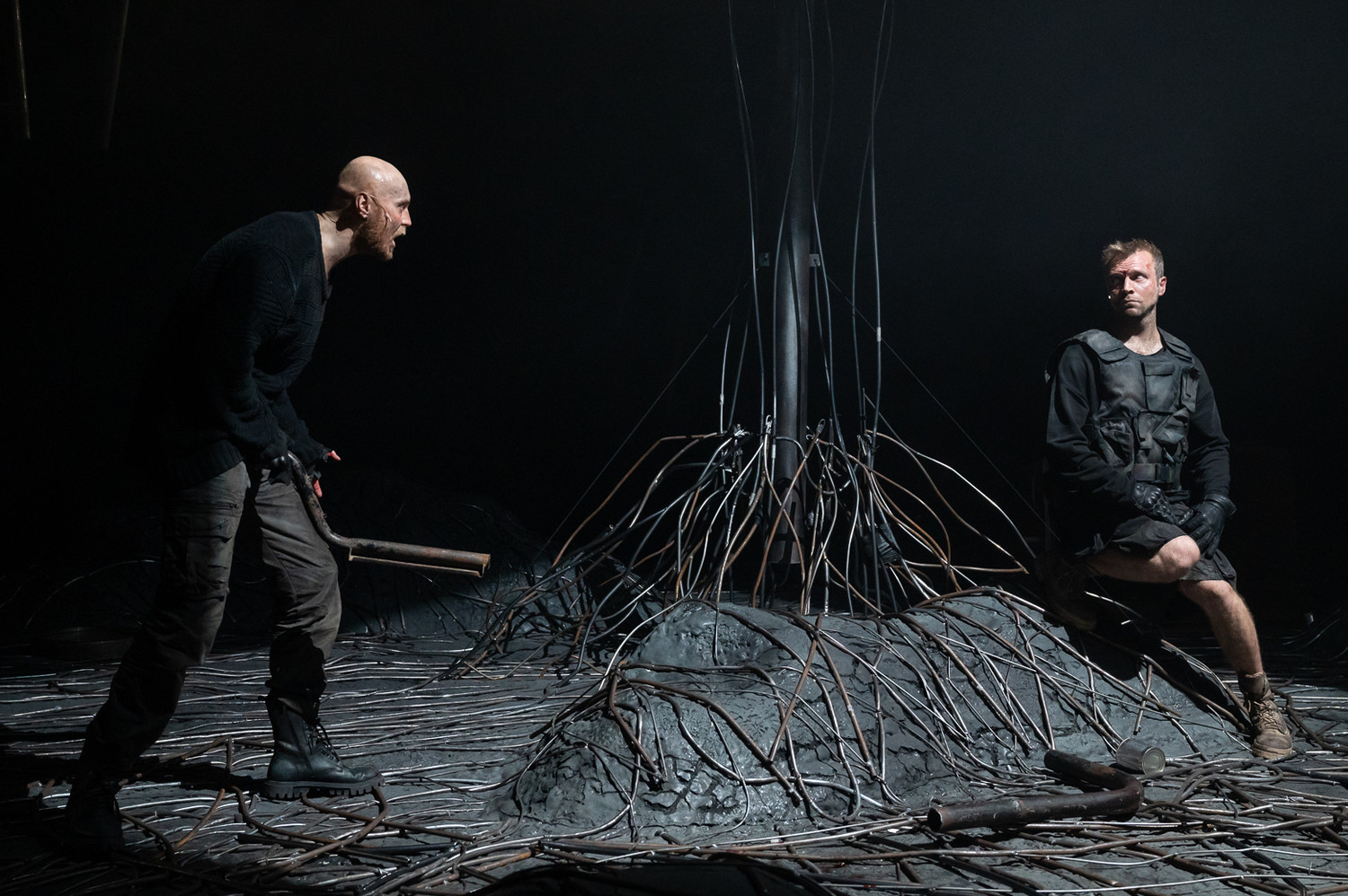 Мёртвое дерево в центре сцены, корни-лианы проводов, вьющиеся по бесплодной скалистой земле; сценография – будто нутро разлагающегося робота-левиафана, чудовищная пустыня, тьма и ржа без конца и края. И разнородный металл, назначенный Петром Айду (одним из трёх, наряду с Николаем Поповым и Олегом Макаровым, композиторов спектакля) в музыкальные инструменты.